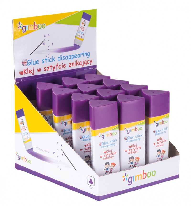 Klej w sztyfcie GIMBOO, PVP, trójkątny, znikający, 15g, 1 szt., pakowany w displayu, fioletowy