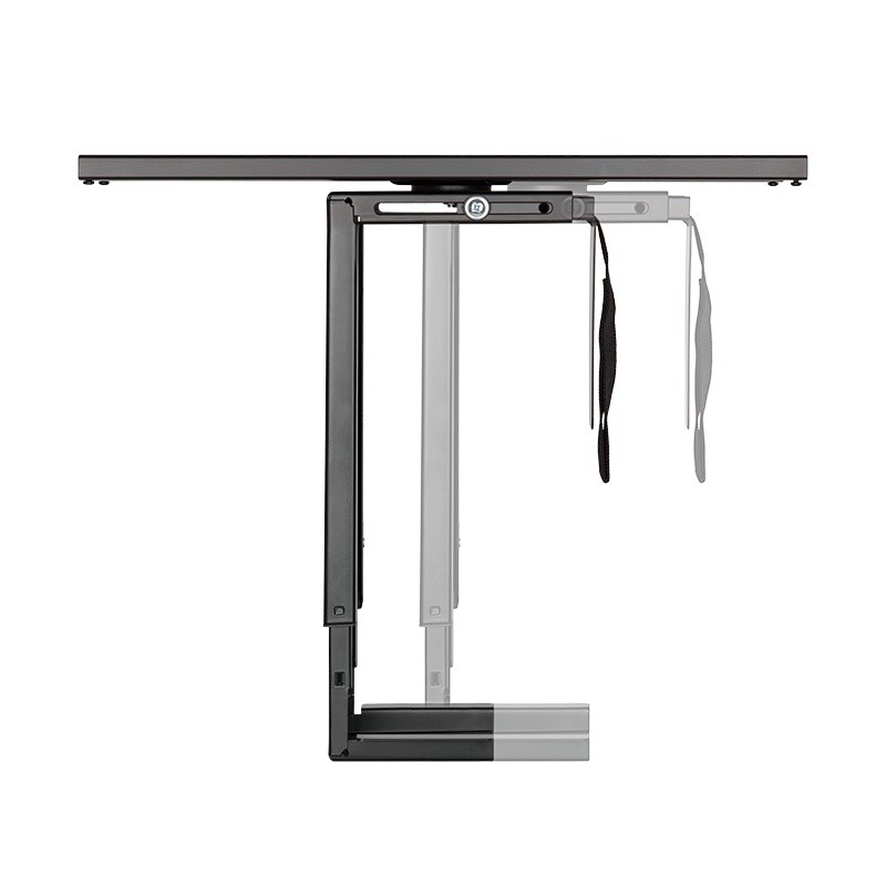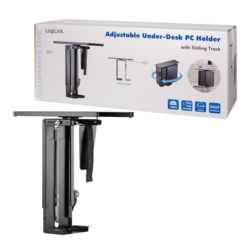 Pozostałe parametry: Pasuje do CPU o wadze do 10 kg Solidny i prosty design Obrotowy o 360° Łatwy uchwyt blokujący Regulowany rozmiar wysokość: 300-510 mm, szerokość: 88-203 mm Mechanizm przesuwania dla lepszej dostępności (zakres przesuwania: 325 mm) Łatwy montaż pod stołem