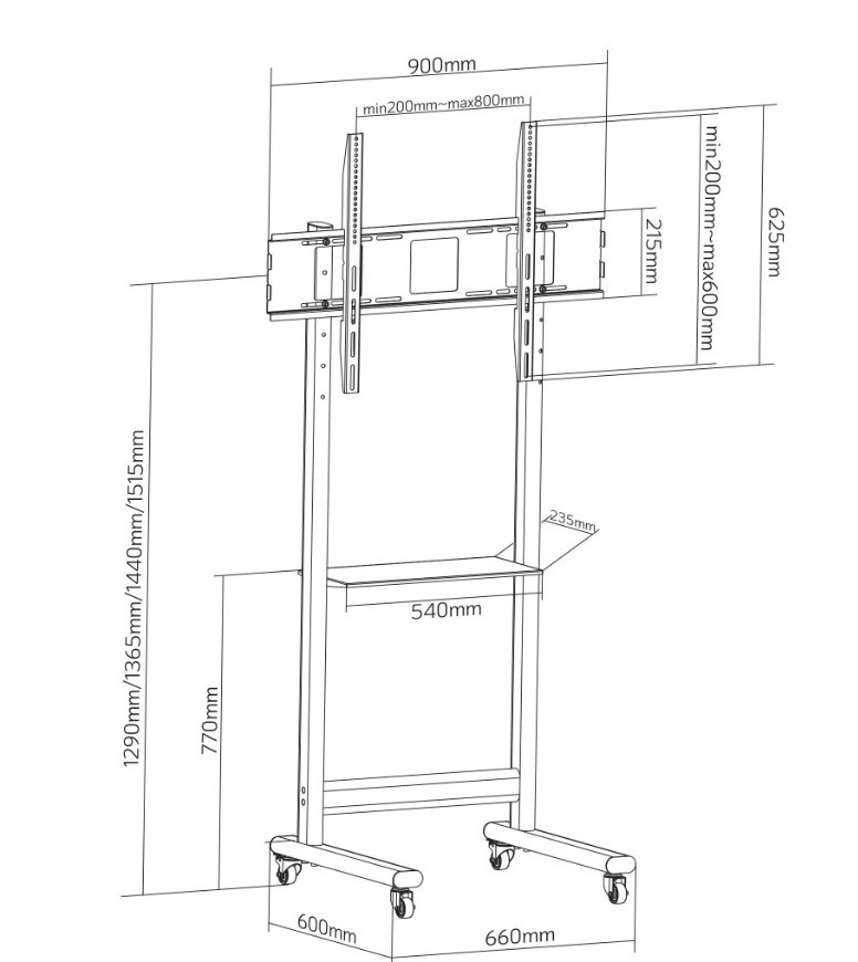 Stojak podłogowy do telewizora z regulowaną wysokością, odpowiedni dla telewizorów o przekątnej od 50" do 90". Wysokość telewizora regulowana w 4 pozycjach: 1290/1365/1440/1515 mm; maksymalna obsługiwana waga: 70 kg. Maksymalna obsługiwana kompatybilność VESA: 800x600; podstawa z 4 kółkami ułatwiającymi przemieszczanie. Wyposażony w wygodną półkę na odtwarzacz DVD lub inne urządzenia/konsolę o wymiarach 540 x 235 mm. Łatwy w instalacji wózek na telewizor; śruby montażowe w zestawie; kolor czarny.