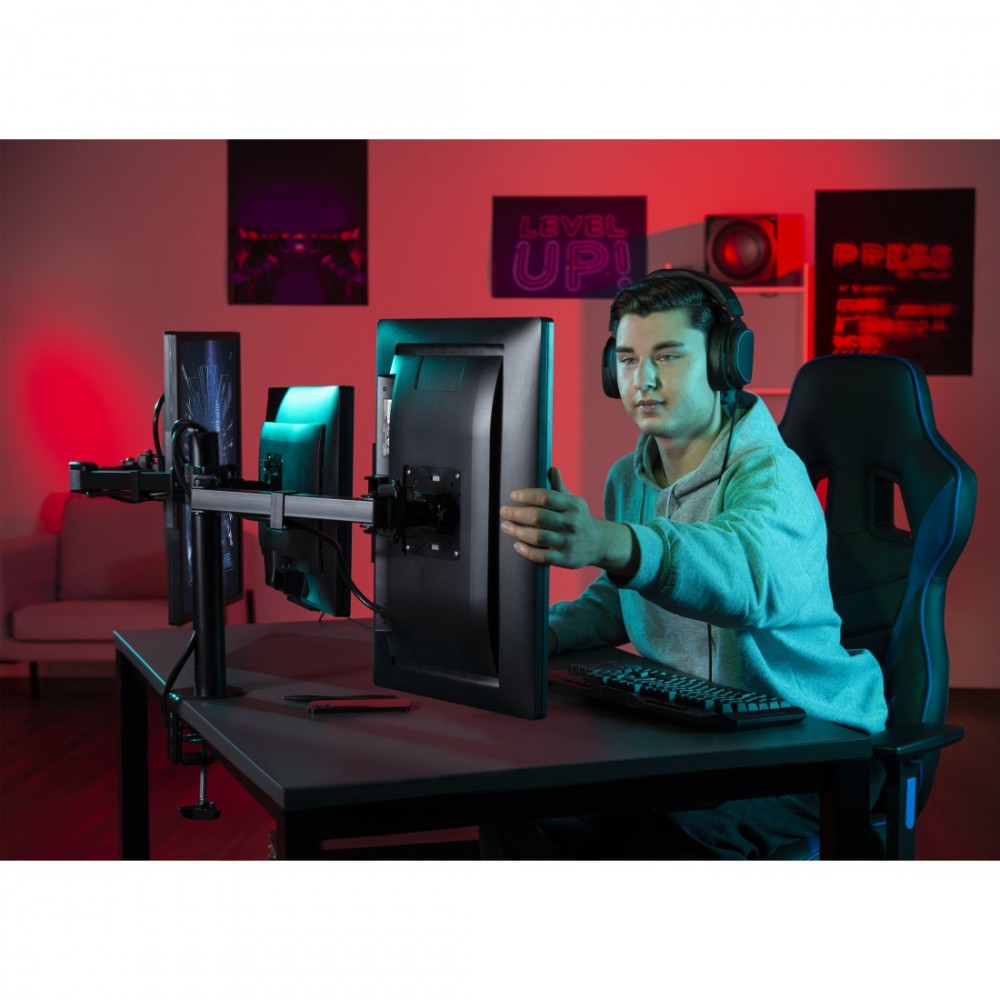 Więcej informacji o produkcie: Większa ergonomia, wygoda i przestrzeń przy biurku z 3 monitorami: dzięki w pełni mobilnej podstawie monitora pozycja stanowiska pracy dostosowuje się do użytkownika, a nie odwrotnie - zapewnia ergonomiczną postawę i zmniejsza ból szyi i pleców. Pracuj, graj i surfuj, chroniąc przy tym kręgosłup: niedroga i ergonomiczna modernizacja biurka, która sprawia, że jest ono idealne także do wielogodzinnych sesji gier. Do instalacji dwóch monitorów TFT/LCD/LED o przekątnej ekranu od 33 do 69 cm (od 13" do 27") Bezstopniowa regulacja wysokości do 40 cm Płynna regulacja nachylenia do +/- 25° Ramiona monitora można obracać w zakresie 180° na 3 przegubach Ramiona monitora można przedłużyć do 64 cm System Easy-Fix umożliwiający łatwą i nieograniczoną orientację ekranów Możliwość mocowania do biurek o grubości do 8,8 cm Dostarczana w zestawie pianka do uchwytu zaciskowego chroni biurko przed zadrapaniami i śladami zużycia