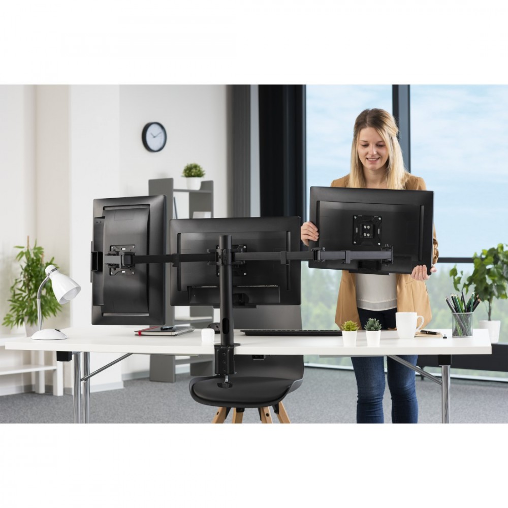 Uchwyt do monitora plus 3 ramiona 13-27 cali Dla ergonomicznego miejsca pracy: ten uchwyt na monitor dopasowuje się do indywidualnych potrzeb i postawy podczas siedzenia możliwość bezstopniowej regulacji wysokości, obracania, przechylania, zdejmowania i ustawiania w orientacji pionowej lub poziomej zapewnia ergonomię w biurze i w domu Odpowiedni do wszystkich powszechnych rozmiarów ekranu, idealny element wyposażenia ergonomicznego biura: ramię monitora jest odpowiednie do ekranów we wszystkich rozmiarach o przekątnej od 33 cm do 69 cm (od 13" do 27") i o masie do 7 kg Dla uporządkowanej organizacji miejsca pracy: osłona na kable umożliwia poprowadzenie kabla monitora w uporządkowany sposób za ekranem, co pozwala uniknąć plątaniny kabli i zaoszczędzić miejsce, a dodatkowo odciąża kabel, chroniąc go przed złamaniem Szybki i łatwy montaż na biurku: uchwyt na monitor można szybko przymocować do biurka dzięki śrubie mocującej. VESA ułatwia montaż monitora najpierw umieścić płytę VESA na monitorze, następnie zawiesić uchwyt monitora i gotowe Sprawdzone bezpieczeństwo urządzenia i 5-letnia gwarancja stanowią dodatkowe zabezpieczenie: wymagające testy obciążenia, stabilności i działania gwarantują wysokie standardy jakości