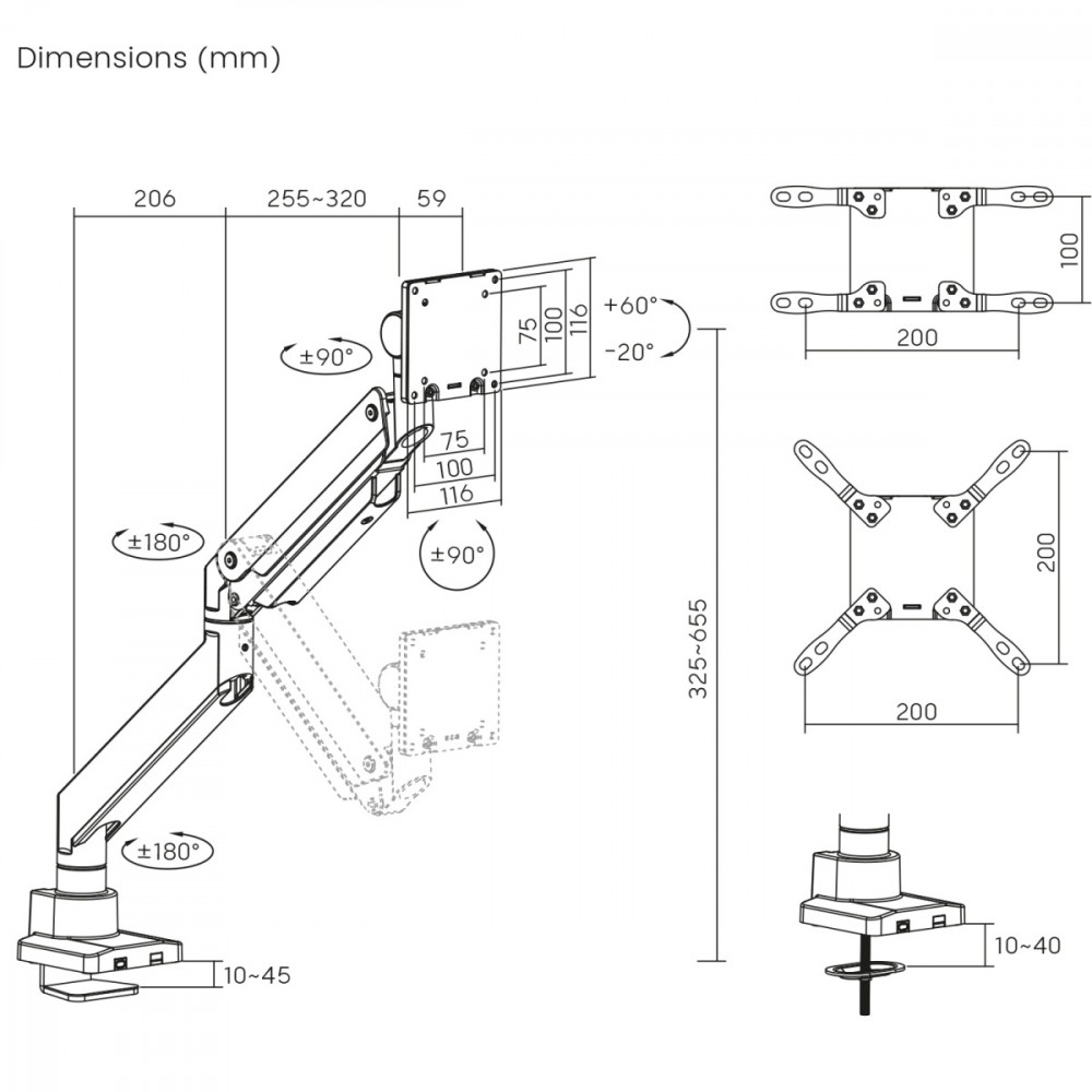 - Standard VESA: 75x75, 100x100, 200x,100, 200x200 mm