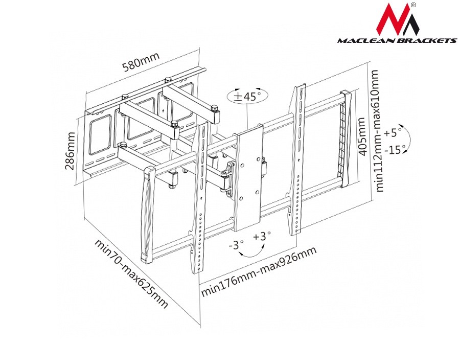 Pozostałe parametry: Możliwość regulacji stopnia nachylenia od +5° do -15° Minimalny/Maksymalny rozstaw w poziomie: 176/920 mm Minimalny/Maksymalny rozstaw w pionie: 112/610 mm Solidna, metalowa konstrukcja, bardzo łatwy montaż Wysoka jakość wykonania - podwójne ramię!