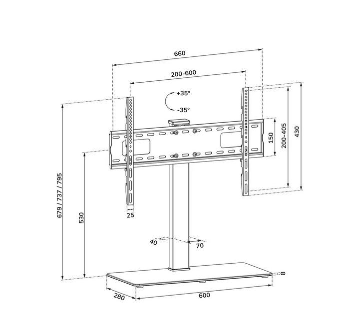Solidna szklana podstawa DS45-430BL16 zapewnia dodatkową stabilność ekranu, nawet przy maksymalnym rozmiarze i wadze. Stanowi doskonałe rozwiązanie dla użytkowników, którzy wolą nie wiercić otworów w ścianach lub dla tych, którzy nie mają już oryginalnego stojaka pod telewizor. Ponadto DS45-430BL16 oferuje również elastyczność w korzystaniu z ekranu, ponieważ stojak pod telewizor można przesuwać w różne miejsca według potrzeb.