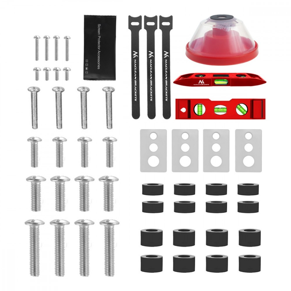 Akcesoria w zestawie: Uchwyt do TV Maclean MC-788 Zestaw śrub montażowych Odpylacz do wiertarki Poziomica 3 opaski zaciskowe do przewodów Ściereczki do ekranu (sucha i mokra) Instrukcja montażu w języku polskim Opakowanie producenta
