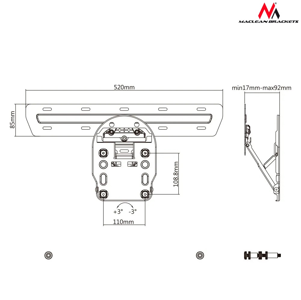 Łatwa i szybka instalacja! Uchwyt uzupełniony jest o kompletny zestaw śrub i kołków oraz instrukcję obsługi, aby instalacja była tak szybka i łatwa, jak to tylko możliwe. Zamontowany uchwyt może być poziomowany w zakresie +3/-3° a regulacja odległości od ściany to 17-92mm.