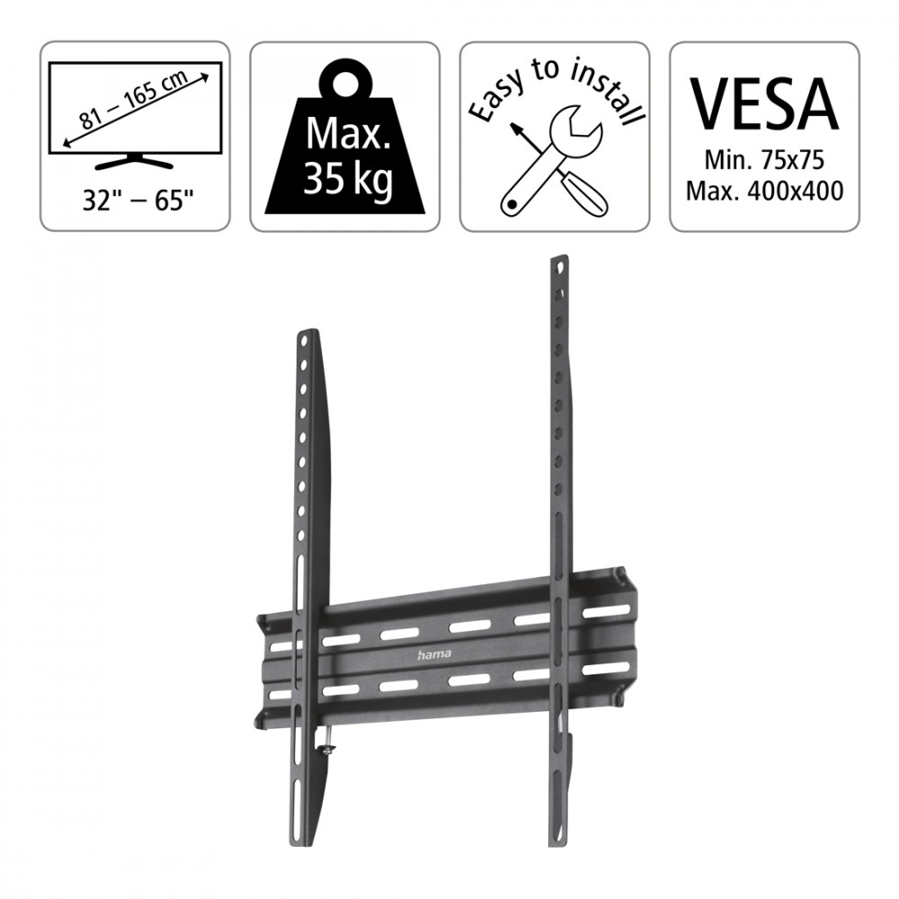 Uchwyt ścienny jest przystosowany do telewizorów w rozmiarze od 32" do 65" (81 - 165 cm). Jest zgodny ze standardem VESA od 75 x 75 do 400 x 400. Maksymalny udźwig uchwytu to aż 35 kg.