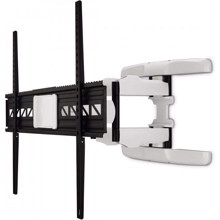 Panel i ramiona podporowe w kolorze białym zlewają się ze ścianą, zapewniając harmonijną aranżację. Natomiast czarna płytka mocująca odpowiada kolorowi telewizora. Takie rozwiązanie pasuje do wystroju wnętrza.