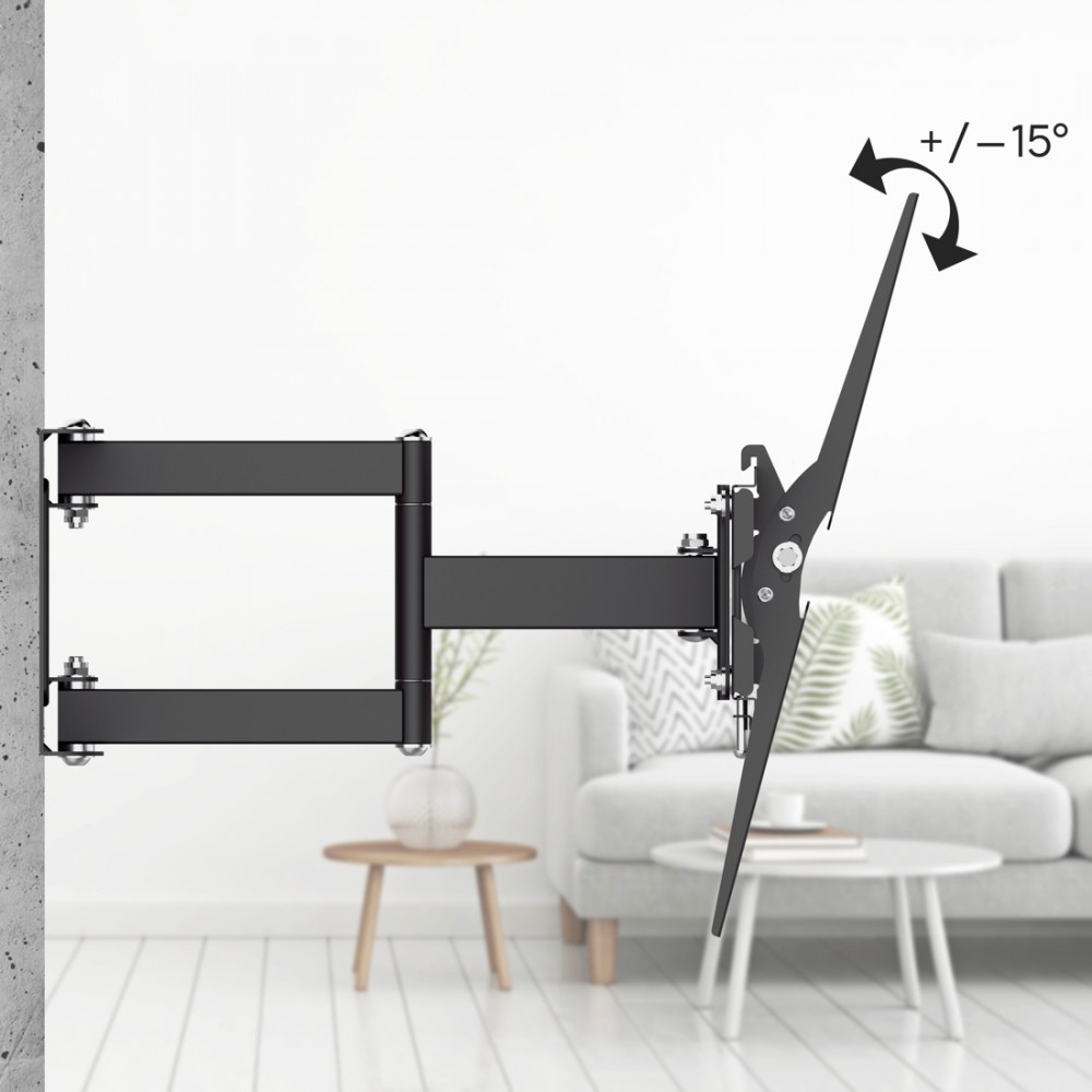 Funkcjonalność: Możliwość pochylenia telewizora Możliwość przesuwania telewizora na boki w zakresie 150° Możliwość oddalania i przybliżania do ściany Łatwy montaż: dołączony zestaw montażowy Pasuje do telewizorów o różnych rozmiarach Utrzymuje TV do 50 kg Stabilne i bezpieczne mocowanie potwierdzone testami Ekologiczne opakowanie: bez plastiku, materiały z certyfikatem FSC Długi okres gwarancji