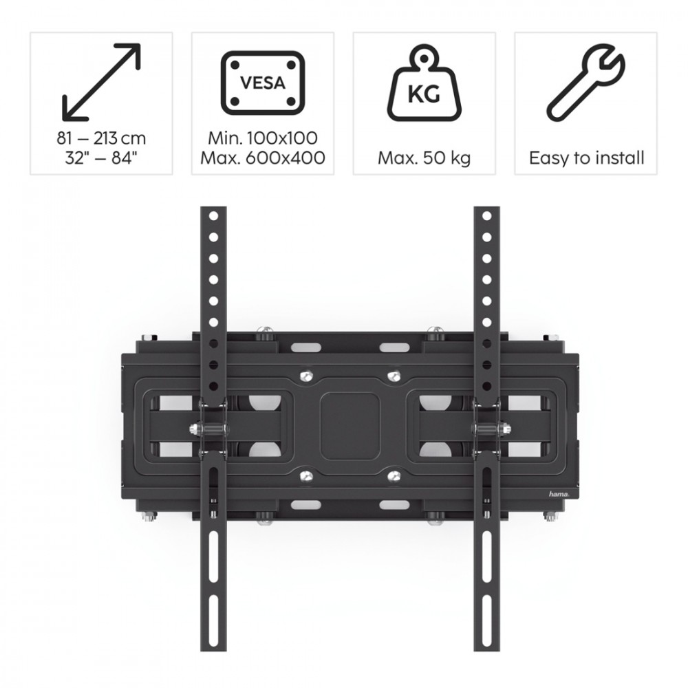 Uchwyt do telewizora Hama jest przeznaczony do urządzeń o przekątnej ekranu od 32" do 84" (81 213 cm). Jest zgodny ze standardem VESA od 100 x 100 do 600 x 400. Maksymalne obciążenie uchwytu wynosi 50 kg.