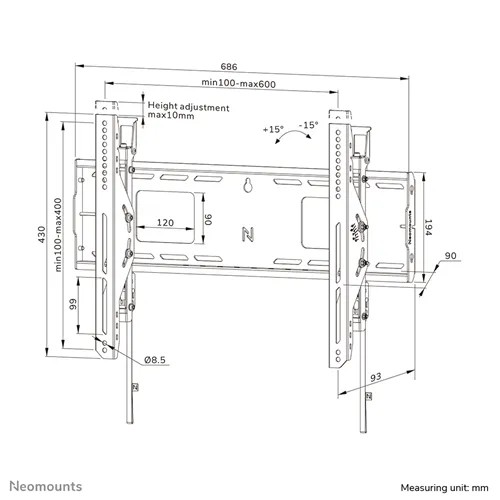 Neomounts WL35-750BL16 LEVEL to najlepsze rozwiązanie z możliwością pochylenia, umożliwiające bezpieczny montaż interaktywnego lub ciężkiego wyświetlacza o przekątnej do 86 cali i maksymalnej nośności 125 kg. Beznarzędziowa regulacja pochylenia (+15°/-15°) umożliwia uzyskanie optymalnego kąta oglądania. Ten wytrzymały uchwyt ścienny ma solidną, profilowaną płytę ścienną i został zaprojektowany z myślą o stabilności i precyzji, zapewniając bezpieczny montaż ekranu nawet na nierównych powierzchniach. Uchwyt ma indywidualne regulowane wsporniki (10 mm) do bezpiecznego regulowania wysokości wyświetlacza lub jego poziomowania.