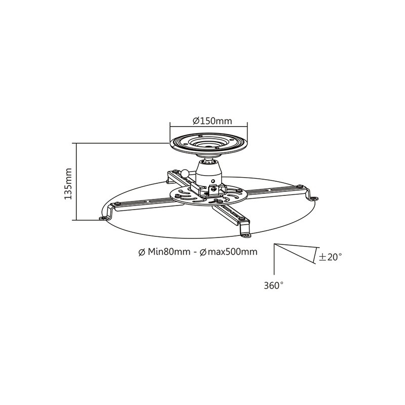 Pozostałe parametry: Nadaje się do projektorów o średnicy koła podziałowego 80500 mm Odległość od sufitu: Projektor sufit 135 mm Obrót: 360°, pochylenie: -20°/+20° Solidna konstrukcja z przegubem kulowym umożliwia obrót o 360° i pochylenie o 20° dla wielu kątów widzenia Zarządzanie kablami: Elegancko ukrywa wszystkie kable podłączone do projektora Akcesoria montażowe w zestawie
