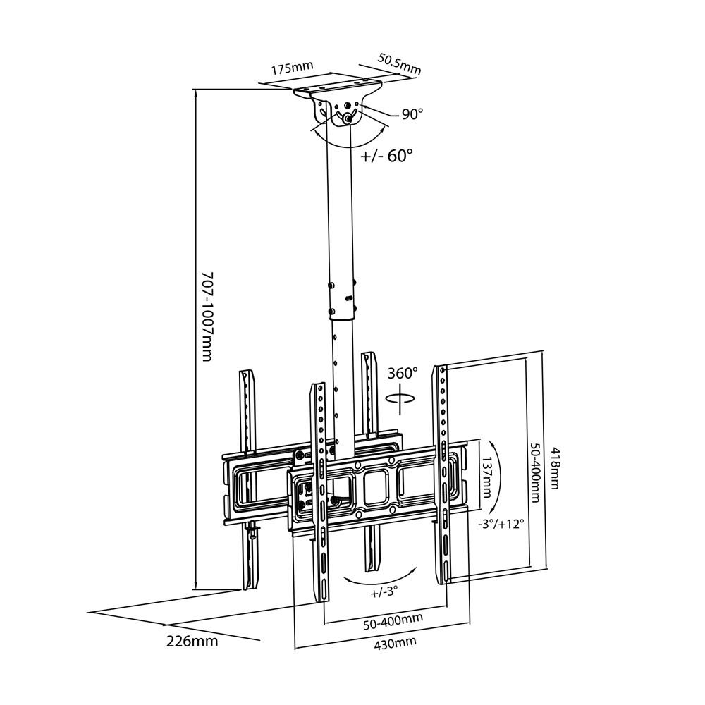 Pozostałe parametry: Maksymalne obciążenie: 35 kg Możliwość regulacji stopnia nachylenia przy uchwycie od -3° do +21 Minimalny/Maksymalny rozstaw w poziomie: 50/400 mm Minimalny/Maksymalny rozstaw w pionie: 50/400 mm Odległość od sufitu: od 707 do 1007 mm Solidna, metalowa konstrukcja, bardzo łatwy montaż VESA 50x50, 100x100, 200x200, 300x300, 200x400, 300x400, 400x400 mm Możliwość obrotu o 360° Wysoka jakość wykonania Lakierowanie proszkowe (kolor czarny) Przeznaczony dla TV 32" do 65" (lub większych, jeśli ich waga nie przekracza 35 kg, a standard VESA jest zgodny z uchwytem) W komplecie zestaw śrub montażowych do sufitu oraz do przykręcenia telewizorów oraz polska instrukcja montażu