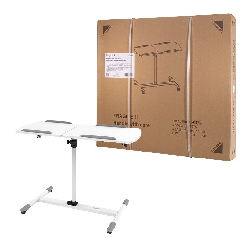 Wszechstronny wózek idealnie nadaje się do różnych funkcji prezentacyjnych, takich jak mównica, stojak na laptopa/komputer. Jest stabilny i bezpieczny dla Twojego projektora, laptopa czy monitora oraz może być łatwo przemieszczać dzięki czterem solidnym kółkom. Model BP0067A jest również doskonały jako wygodne miejsce pracy dzięki swojej regulowanej wysokości stalowej konstrukcji. Możesz pochylić obrotowy stolik do 35° w górę i w dół. Stopki zabezpieczające zapobiegają przesunięciu się sprzętu.