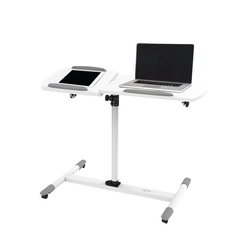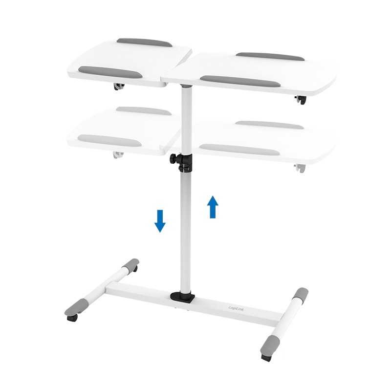 Pozostałe parametry: Może być używany jako mównica, stojak na laptopa/komputer lub wygodne miejsce pracy Cztery solidne kółka (dwa z blokadą) Materiał: MDF (płyta pilśniowa średniej gęstości) i melamina, stal Typ montażu: wolnostojący Płynnie regulowana wysokość: 700-1100 mm Regulacja wysokości: manualna Obie blaty pochylnie do 35° w górę i w dół Stopki zabezpieczające zapobiegają przesunięciu się sprzętu Wymiary powierzchni roboczej WxG: 400x420 mm i 500x420 mm Maksymalny udźwig: 10 kg (każda blacha)