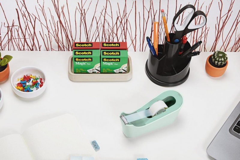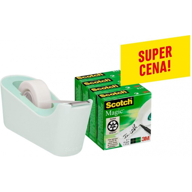 Scotch Magic to jedna z najpopularniejszych taśm na świecie - do domu, biura i szkoły idealna do naprawiania i sklejania dokumentów, zaklejania kopert oraz przyklejania zdjęć i grafik matowa na rolce, niewidoczna po naklejeniu na papier, także na fotokopiach, skanach i zdjęciach zestaw promocyjny to więcej Twojej ulubionej taśmy z podajnikiem w SUPER CENIE taśma z podajnikiem to idealny zestaw dla każdego, kto często korzysta z taśmy dzięki podajnikowi z obciążoną podstawą i metalową gilotyną, taśmę odetniesz jedną ręką do podajnika pasują wszystkie taśmy Scotch o szerokości do 19mm i długości do 33m grubość taśmy: 56 mikronów klej syntetyczny akrylowy odporny na żółknięcie i wysychanie, Adhezja do stali 15 N/cm opakowanie zawiera 4 rolki taśmy klejącej Scotch Magic w rozmiarze 19mm x 33m i odajnik C-18 kolor taśmy: transparentny kolor podajnika: miętowy