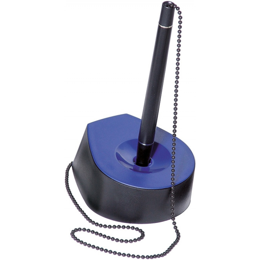 długopis na łańcuszku, tusz na bazie oleju wykonany z trwałego polistyrenu stabilna, specjalnie dociążona podstawa średnica kulki: 1mm grubość linii pisania: ok. 0,47-0,50mm długość linii pisania: ok. 3000m długość łańcuszka: 55cm średnica otworu: 11,4mm wymiary podstawy: 68x95x40mm kolor wkładu czarny kolor czarno-niebieski