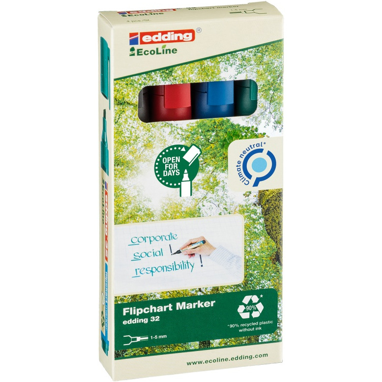 marker do flipchartów specjalnie zaprojektowany do pisania i znakowania na papierze flipchartowym, prezentacyjnym i innych rodzajach papieru co najmniej 90% plastikowych elementów wyprodukowanych zostało z materiałów pochodzących z recyklingu (83% surowców wtórnych) produkt neutralny dla klimatu zgodnie z ClimatePartner-ID 13742-1910-1001 ścięta końcówka o szerokości pisania 1-5 mm tusz o neutralnym zapachu, dostępny w wielu jaskrawych kolorach, nie przebija na następne strony dzięki technologii cap-off mogą być pozostawione bez zatyczki nawet na kilka tygodni bez ryzyka wyschnięcia (testy przeprowadzone zgodnie z normami ISO 554) zestaw zawiera kolory: czarny, czerwony, niebieski i zielony produkt do wielokrotnego napełniania tuszem uzupełniającym edding FTK 25 zapasowe końcówki (wymienne końcówki do edding 32/383) są dostępne opakowanie 4 szt. mix kolorów