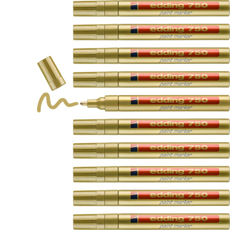 Marker lakierowy Edding - w aluminiowej obudowie (modele 750, 751), z wodoodpornym, szybkoschnącym, odpornym na ścieranie i działanie temperatury, dobrze kryjącym tuszem pigmentowym bez dodatku toluenu i ksylenu, o kryciu zbliżonym do lakieru. Marker wyposażony jest w system kontroli dopływu tuszu do końcówki. Końcówka okrągła o szerokości linii pisania: 750 - ok. 2 - 4 mm, 751 - ok.1 - 2 mm. Do wykonywania oznaczeń na niemal wszystkich powierzchniach (także porowatych). Szczególnie przydatny do znakowania powierzchni ciemnych i przezroczystych. Szeroka gama kolorystyczna - jednostka sprzedaży 1 sztuka