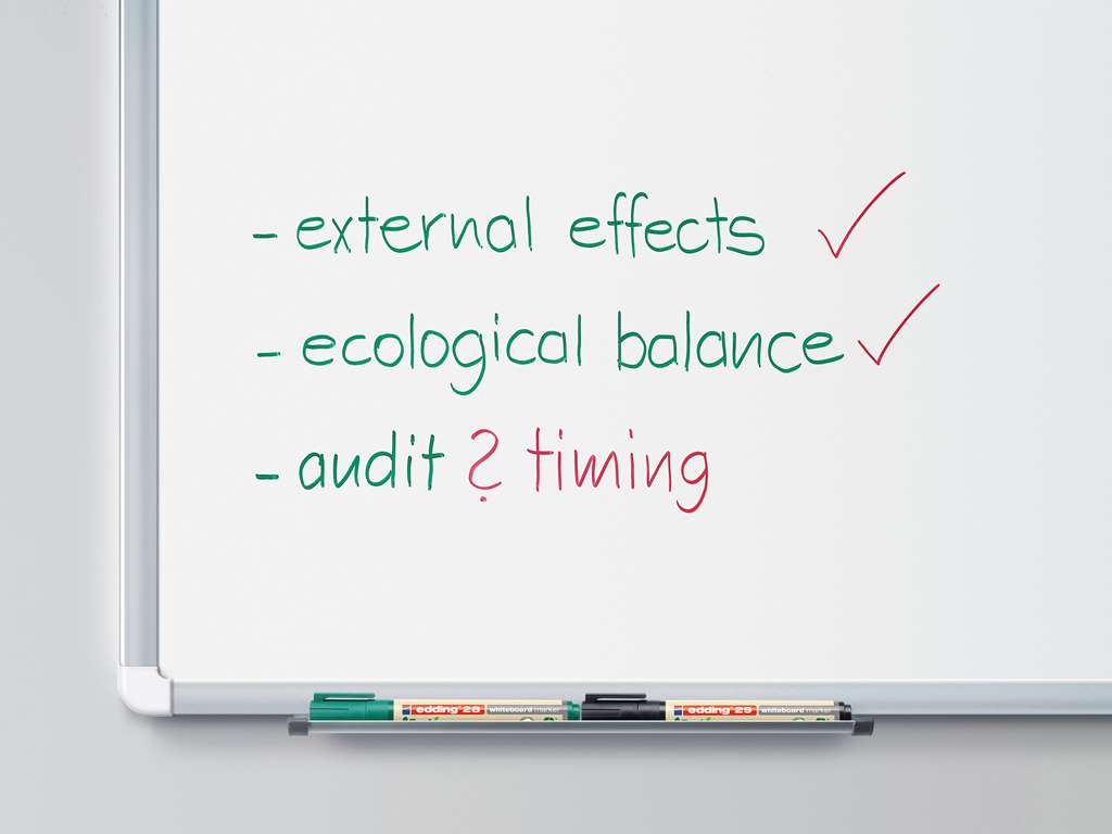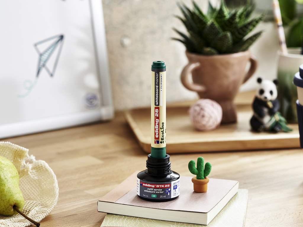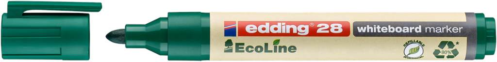 Ekologiczny marker do tablic suchościeralnych. Minimum 90% plastiku użytego do produkcji pochodzi z materiałów odnawialnych. Końcówka okrągła, szerokość linii pisania 1,5-3 mm. Może być czasowo pozostawiony bez zatyczki bez utraty właściwości piszących. Bez dodatku octanu butylu.