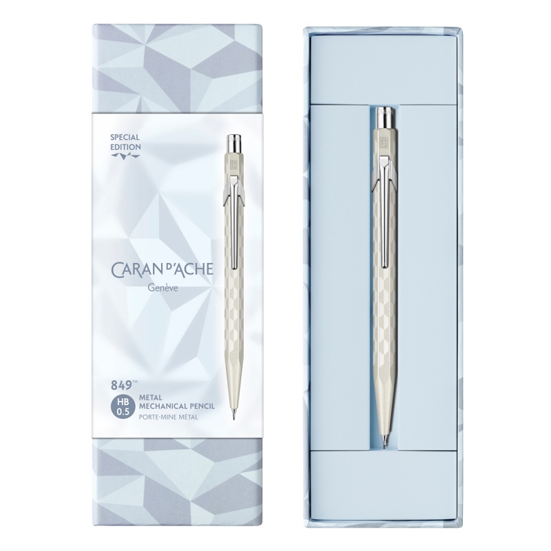 Ołówek został zaprojektowany z myślą o trwałości, jest nasycony kreatywnością, know-how i silnymi wartościami Caran d'Ache. Ołówek posiada sześciokątny aluminiowy korpus, jest lekki i trwały. Wzór ołówka inspirowany jest śnieżnymi barwami i migoczącymi refleksami zimowego szronu. Ołówek posiada przyciskowy mechanizm wysuwu grafitu 0,5mm i gumkę ukrytą pod przyciskiem.