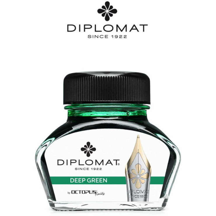 Atrament marki DIPLOMAT z kolekcji Octopus Diplomat z dumą ogłasza rozpoczęcie współpracy z laboratorium Octopus Fluids i wprowadza do swojej oferty 15 nowych kolorów atramentów. Produkcja atramentu jest tradycją w Dreźnie od XIX wieku a Octopus to firma, która podtrzymuje tradycję produkcji wysokiej jakości atramentów. Dla marki Diplomat było bardzo ważne, aby znaleźć lokalnego partnera do współpracy w zakresie stworzenia nowej gamy kolorów atramentów. Efektem tej współpracy jest szeroka gama jaskrawych kolorów atramentów w eleganckich butelkach, opracowanych tak, aby pasowały do kolorystyki piór wiecznymi Diplomat. Atrament jest umieszczony w szklanym flakonie o pojemności 30ml. Kolor ciemnozielony