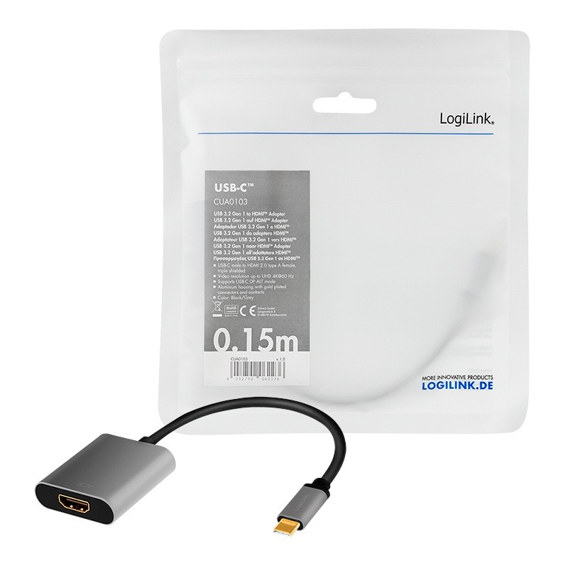 Pozostałe parametry: Złącze 1: USB-C (męskie) Złącze 2: HDMI-A (żeńskie) Zgodność z USB 3.2 Gen1 SuperSpeed Podłączone urządzenia muszą obsługiwać tryb alternatywny USB-C DP/HDMI Rozdzielczość: Ultra HD do 4K/60 Hz (3840x2160) 2x ekranowany Aluminiowa obudowa Pozłacany