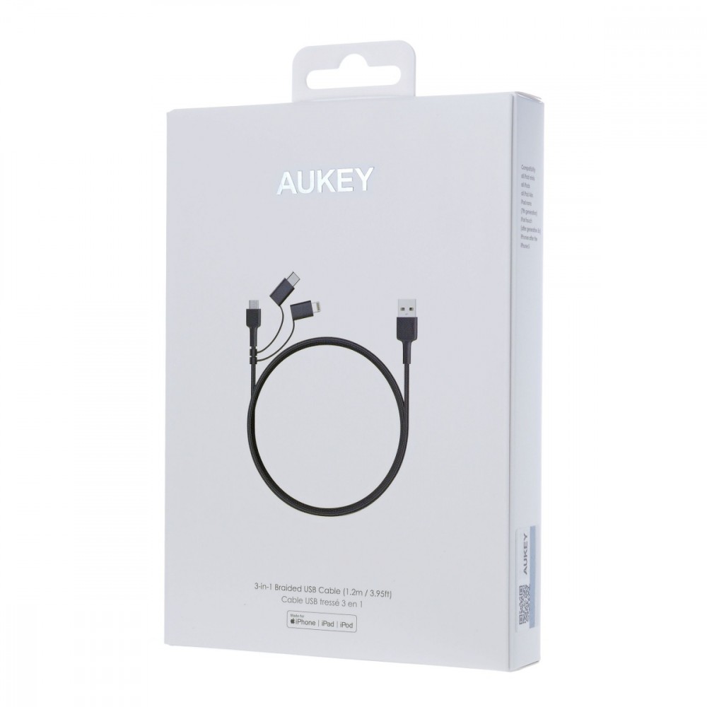 AUKEY CB-BAL5 3w1 ultraszybki kabel Quick Charge micro USB | USB C | Lightning Uniwersalność - wbudowane 3 wtyki - micro USB, USB C oraz Lightning MFi Apple Synchonizacja i ładowanie - kabel pozwala na szybkie ładowanie i synchronizację danych między komputerem a urządzeniami Apple Certyfikat MFI Apple - zweryfikowany numer seryjny i chip autoryzacji wydany przez firmę Apple pozwalają na bezproblemową komunikację z dowolnym urządzeniem, które zostało wyposażone w wejście Lightning Optymalna długość - długość kabla CB-BAL5 (120 cm) idealnie sprawdza się w warunkach, w których dostęp do gniazda zasilania lub portu USB jest utrudniony Nylonowa plecionka wykonana z ekologicznych materiałów premium. Bardzo wytrzymała i zapobiegająca plątaniu się. Kindle Fire Wielowarstwowe ekranowanie Kabel spełnia wymagania Quick Charge 3.0 / 2.0 / 1.0 oraz AiPower