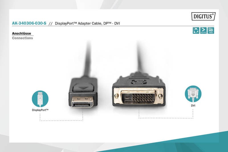 Kabel adapterowy DisplayPort, DP DVI (24+1) Wt/wt, 3,0 m, z blokadą, kompatybilny z DP 1.1a, CE