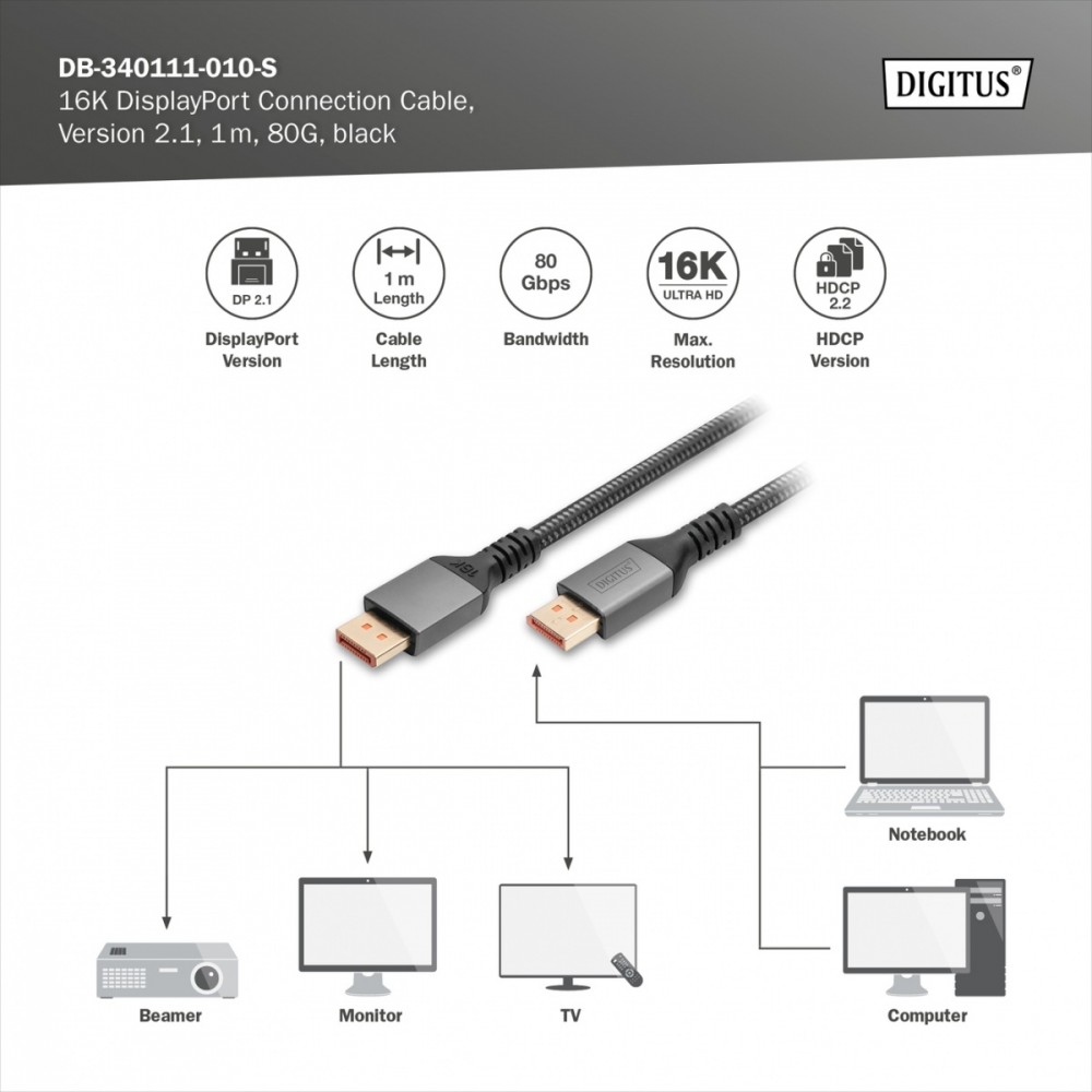 Pozostałe parametry: Rozdzielczość ekranu 16K / 60Hz Obsługa Dynamic HDR 4:4:4 / HDR 10 i 3D Wersja HDCP: 2.2 UHBR20 AWG: 30 Powierzchnia styku: Pozłacana Standard DisplayPort: DisplayPort 2.1 Standard HDTV: Ultra HD 8K Typ obudowy: Aluminum Podwójne ekranowanie