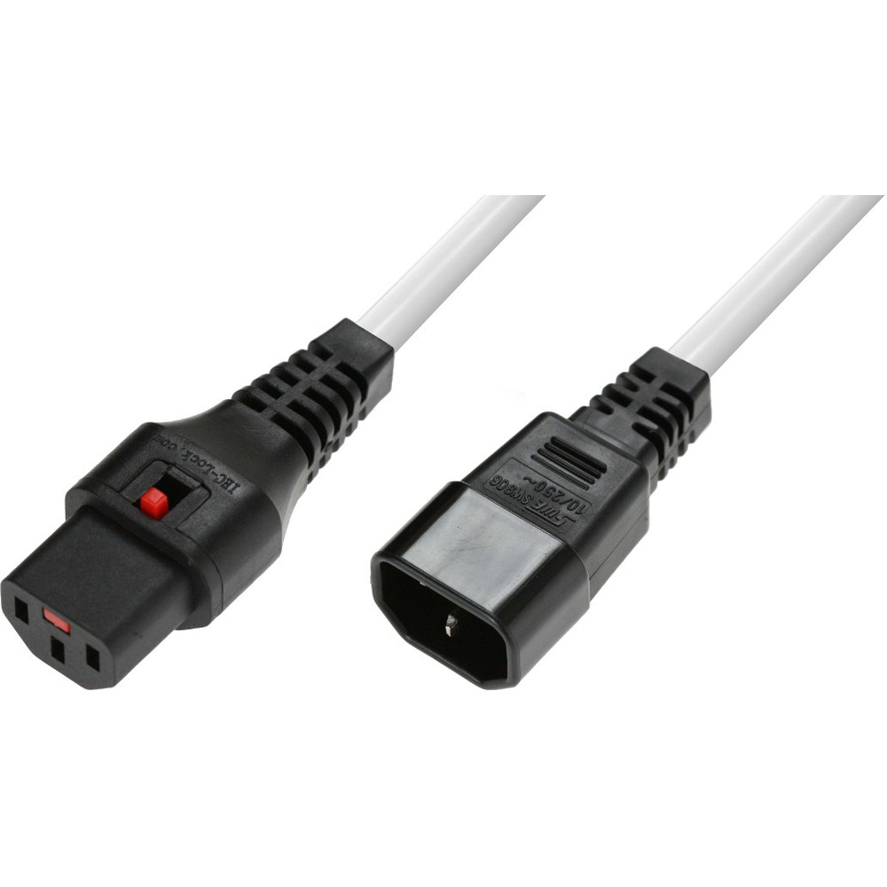 Przewód o długości 3m w kolorze białym, posiadający złącze proste IEC C14 oraz proste IEC C13, wyposażony w system blokujący IEC LOCK. Zastosowanie takiego przewodu zabezpiecza każde podłączone do niego urządzenie przed nagłą utratą zasilania w wyniku przypadkowego wypięcia, wibracji lub innych działań. Niewątpliwą zaletą systemu IEC LOCK jest jego uniwersalność, gdyż przewody lub wtyki z blokadą mogą być stosowane ze wszystkimi standardowymi gniazdami IEC. Zblokowanie następuje automatycznie po wpięciu przewodu, zaś jego odłączenie możliwe jest dopiero po zwolnieniu przycisku blokady. Przewód posiada uziemienie, co dodatkowo gwarantuje bezpieczeństwo podłączonych urządzeń.