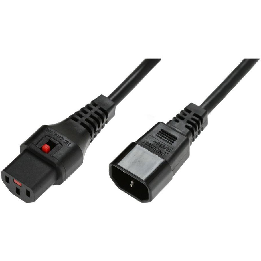 Przewód o długości 3m w kolorze czarnym, posiadający złącze proste IEC C14 oraz proste IEC C13, wyposażony w system blokujący IEC LOCK. Zastosowanie takiego przewodu zabezpiecza każde podłączone do niego urządzenie przed nagłą utratą zasilania w wyniku przypadkowego wypięcia, wibracji lub innych działań. Niewątpliwą zaletą systemu IEC LOCK jest jego uniwersalność, gdyż przewody lub wtyki z blokadą mogą być stosowane ze wszystkimi standardowymi gniazdami IEC. Zblokowanie następuje automatycznie po wpięciu przewodu, zaś jego odłączenie możliwe jest dopiero po zwolnieniu przycisku blokady. Przewód posiada uziemienie, co dodatkowo gwarantuje bezpieczeństwo podłączonych urządzeń.