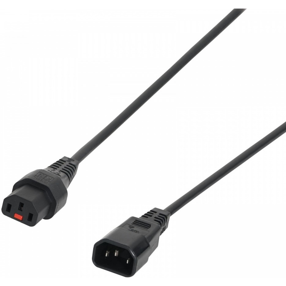 Przewód o długości 5m w kolorze czarnym, posiadający złącze proste IEC C14 oraz proste IEC C13, wyposażony w system blokujący IEC LOCK. Zastosowanie takiego przewodu zabezpiecza każde podłączone do niego urządzenie przed nagłą utratą zasilania w wyniku przypadkowego wypięcia, wibracji lub innych działań. Niewątpliwą zaletą systemu IEC LOCK jest jego uniwersalność, gdyż przewody lub wtyki z blokadą mogą być stosowane ze wszystkimi standardowymi gniazdami IEC. Zblokowanie następuje automatycznie po wpięciu przewodu, zaś jego odłączenie możliwe jest dopiero po zwolnieniu przycisku blokady. Przewód posiada uziemienie, co dodatkowo gwarantuje bezpieczeństwo podłączonych urządzeń.