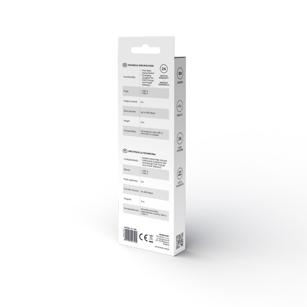 Kabel USB-A - USB-C, 2A, 3m, CL-168
