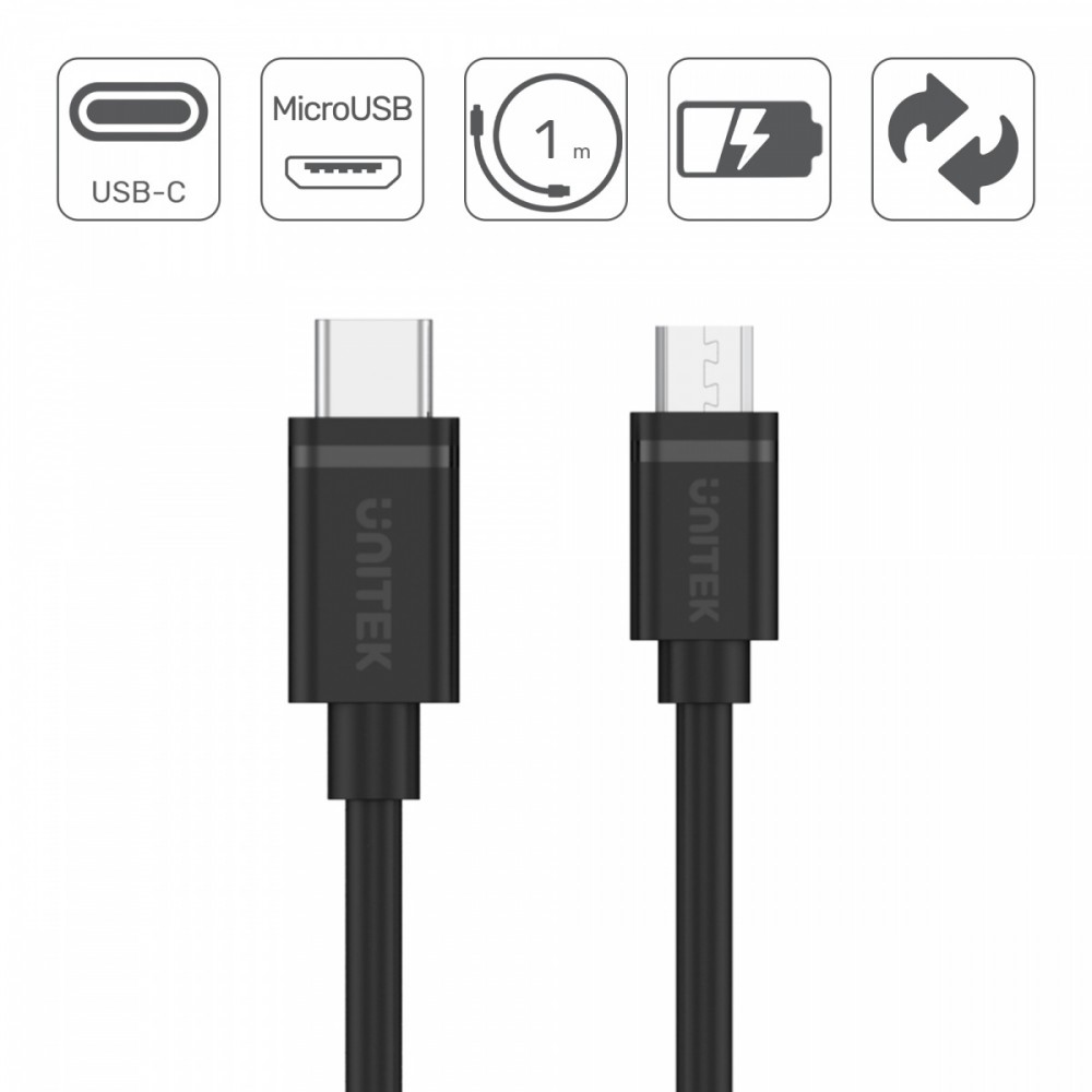 Unitek Y-C473BK to przewód USB Typ-C - micro USB, o długości 1 m, służący do ładowania i synchronizacji szeregu urządzeń takich jak latarki, rejestratory obrazu, akumulatory, aparaty, tablety graficzne, smartphoney, tablety i wiele więcej. Złącze USB-C jest bezpieczne i wygodne w użyciu jest symetryczne, czyli nie trzeba uważać którą stroną się je podłącza tak jak to było w poprzednich wersjach USB.