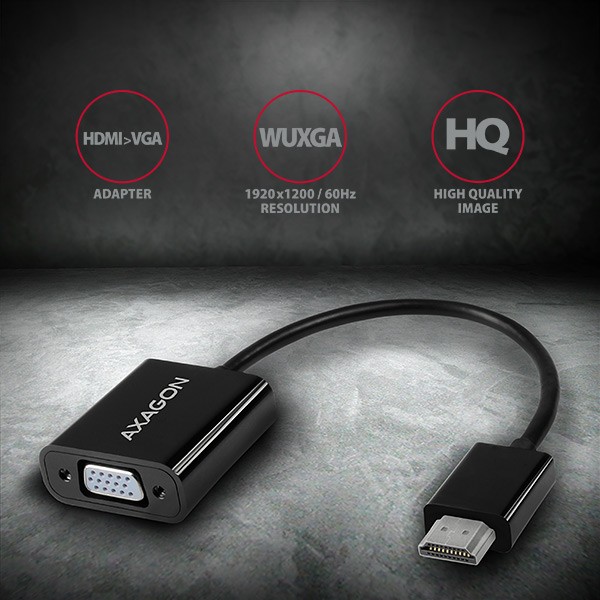Aktywny adapter HDMI -> VGA AXAGON RVH-VGN do podłączenia starszego monitora VGA / telewizora / projektora do komputera lub innego urządzenia z wyjściem HDMI. Można go również używać z przystawkami STB lub konsolami Xbox i PlayStation.