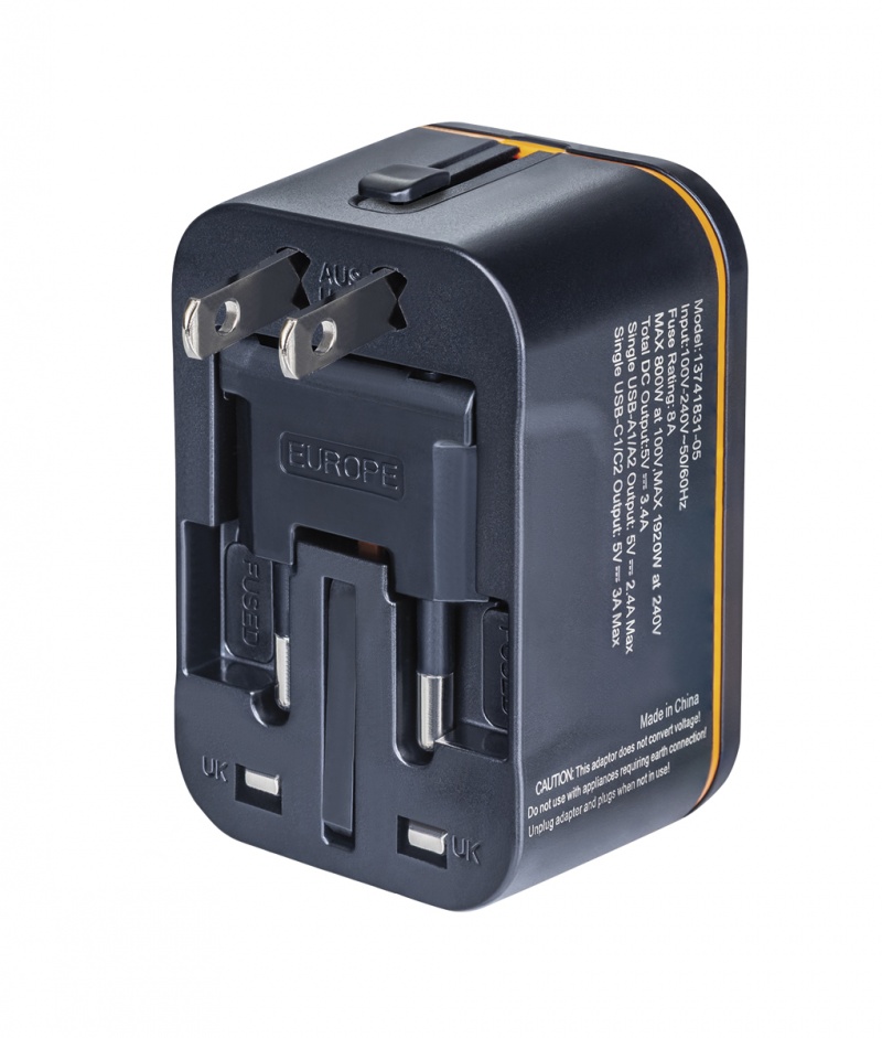 w jednym kompaktowym korpusie znajdują się wysuwane wtyczki EU, UK, USA i AUS oraz nowoczesna technologia, co pozwala szybciej zasilać smartfon, tablet, aparat cyfrowy, konsole do gier, odtwarzacz mp3, czy ultrabook i efektywniej wykorzystać czas w podróży służbowej lub turystycznej