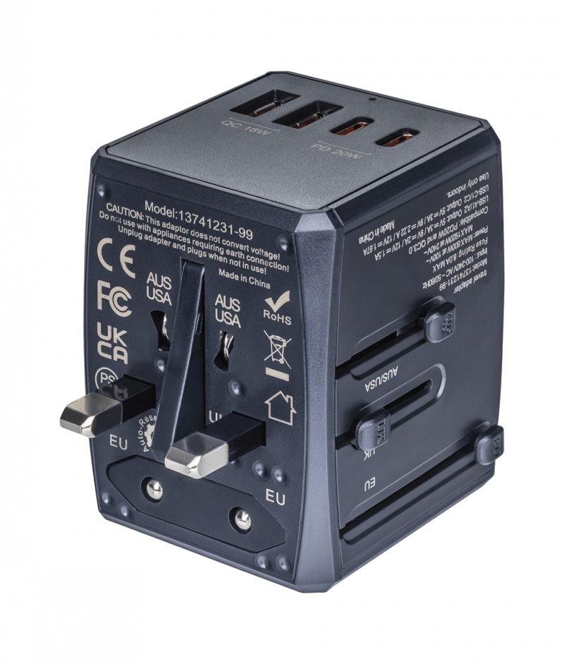 w jednym kompaktowym korpusie znajdują się wysuwane wtyczki EU, UK, USA i AUS oraz nowoczesna technologia, co pozwala szybciej zasilać smartfon, tablet, aparat cyfrowy, konsole do gier, odtwarzacz mp3, czy ultrabook i efektywniej wykorzystać czas w podróży służbowej lub turystycznej