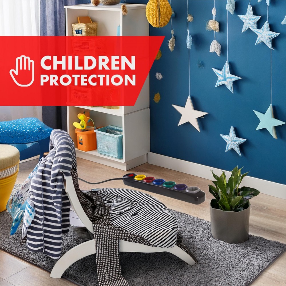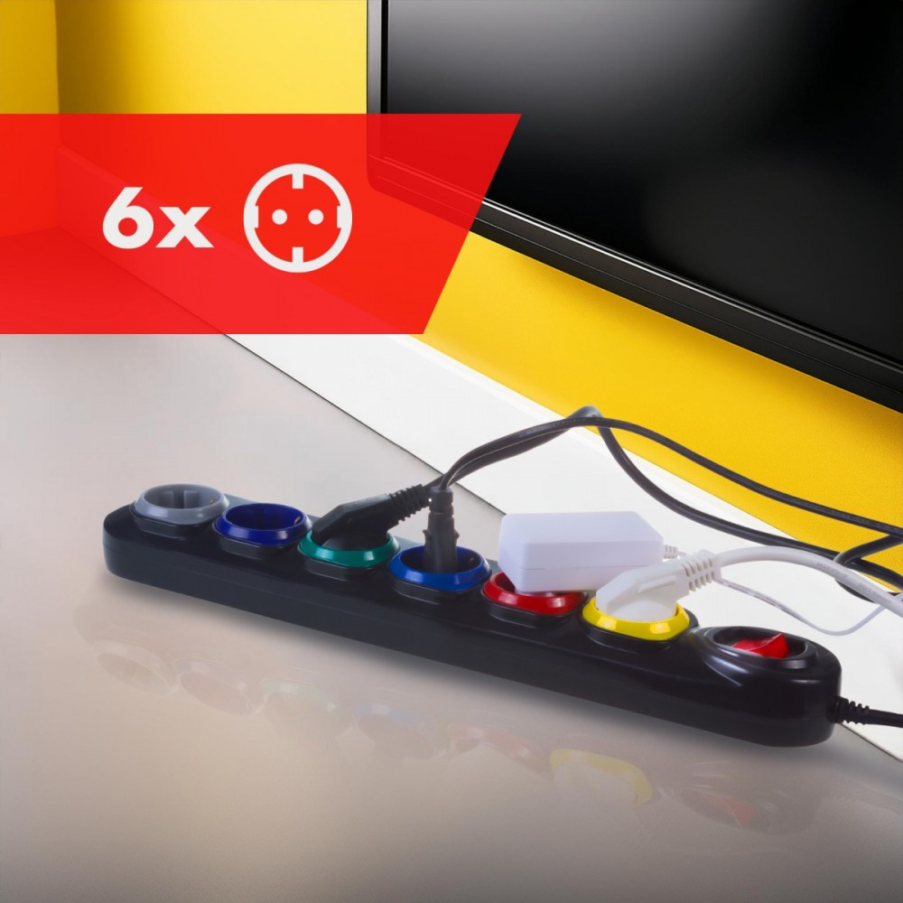 Pozostałe parametry: 6 kolorowych gniazd z uziemieniem Prąd znamionowy: 10 A Napięcie znamionowe: 250 V AC Częstotliwość znamionowa: 50 Hz Stopień ochrony: IP20 Max. obciążenie: 2500 W