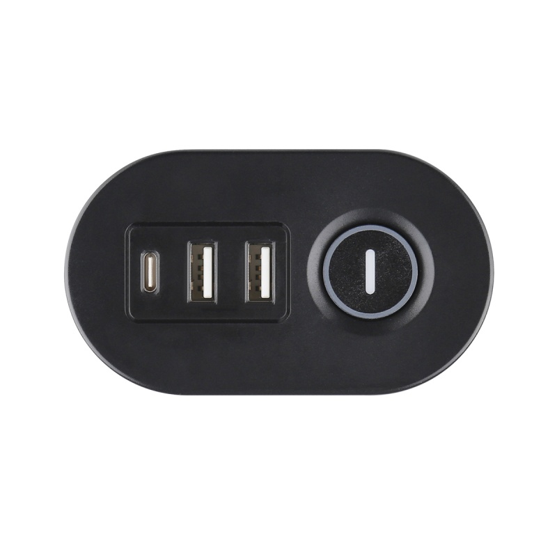 posiada 3 gniazda z zabezpieczeniem oraz porty USB: 2 x USB-A, 1 x USB-C umieszczone na górze dla wygodnego dostępu