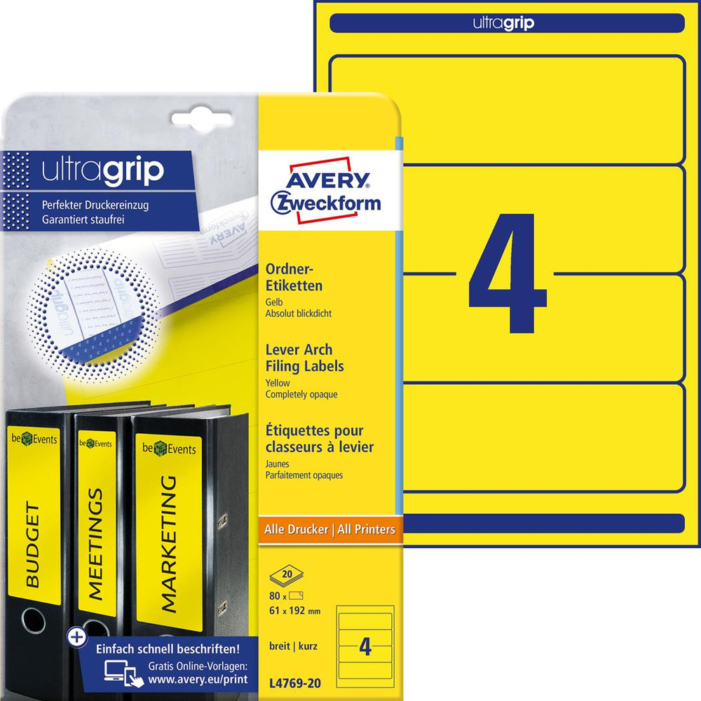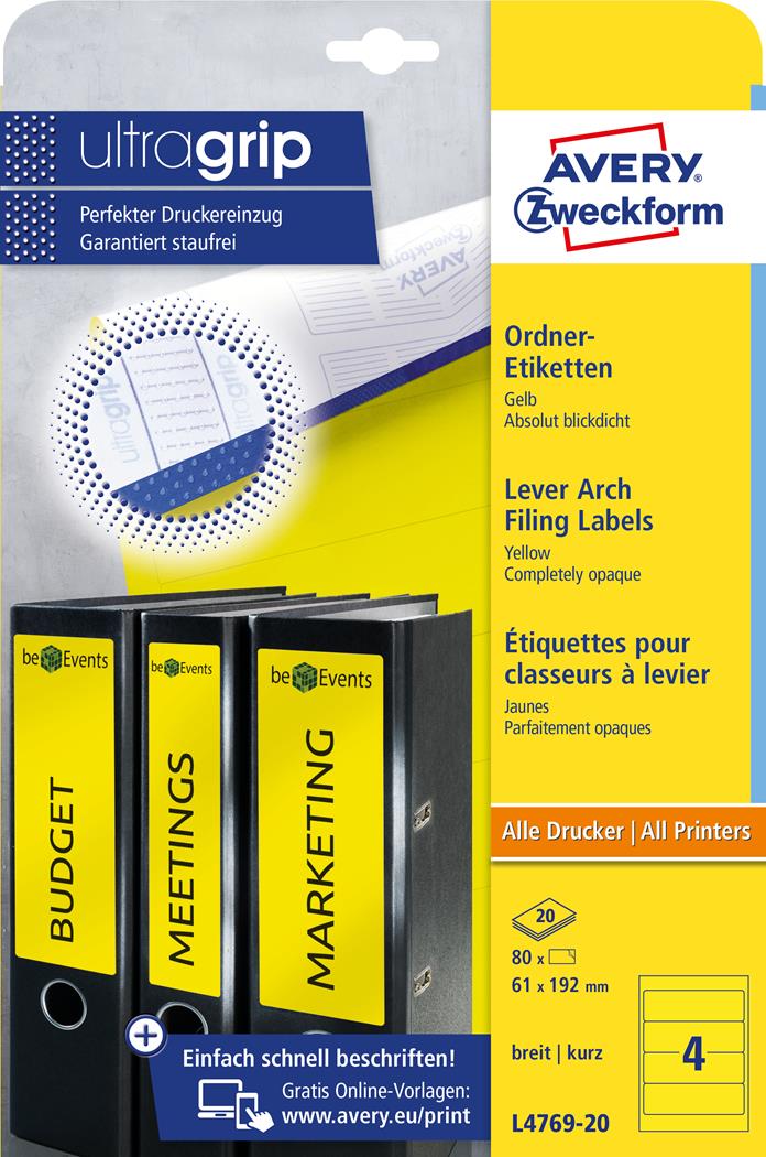 Etykiety na segregatory L4769-20 61 x 192 20 ark żółte, Avery Zweckform (X)