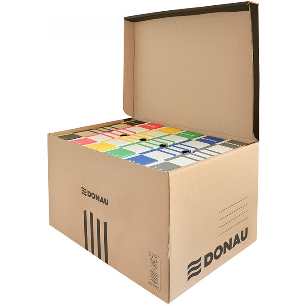 wykonane z trójwarstwowej tektury falistej o gramaturze 450gsm produkt bezkwasowy, wskaźnik pH ok. 7,5 typ fali: C mieści np. 6 pudełek 80mm lub 5 pudełek 100mm lub 4 pudełka 120mm lub 2 pudełka 155mm+1 pudełko 200mm lub 2 pudełka 200mm + 1 pudełko 100mm wzmocnione dno i uchwyty pozwalają przenosić nawet najbardziej dociążone segregatorami/pojemnikami pudło zintegrowana klapa otwierana od góry ułatwia dostęp do dokumentów bez konieczności wyjmowania pudełek z pudła zbiorczego kompatybilne z pudłem wzmocnionym otwieranym z przodu - specjalne otwory w dnie i wypustki w klapie ułatwiają składowanie pudeł piętrowo składane, proste w montażu certyfikat FSC gwarantuje, że surowiec potrzebny do produkcji wyrobu pochodzi z lasów zarządzanych w odpowiedzialny sposób; promuje on trwałą gospodarkę leśną opartą o najwyższe światowe standardy w dziedzinie ochrony przyrody i gwarantuje legalność pochodzenia surowca udźwig do 26kg wymiary zewnętrzne: 558x370x315mm ( 5mm) kolor brązowy