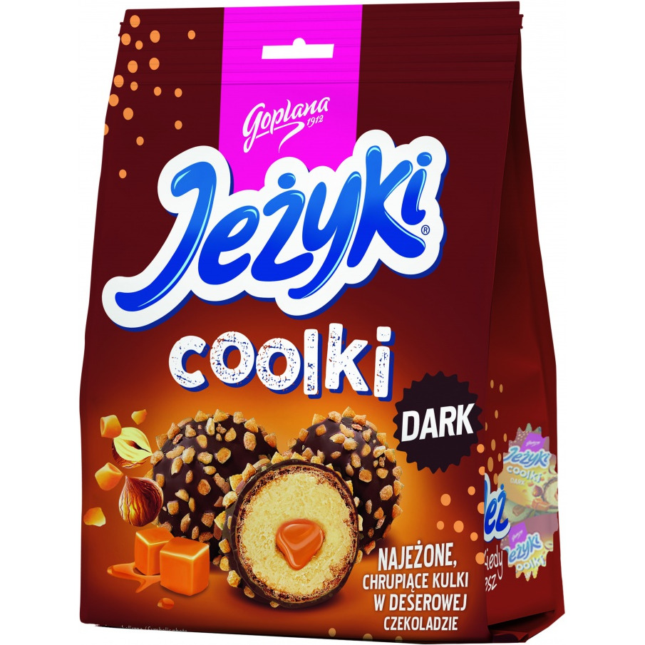 Kultowe i uwielbiane Jeżyki w formie delikatnych, waflowych kulek, wypełnionych pysznym, karmelowym kremem, oblane czekoladą deserową i obsypane orzechami z kroplą karmelu w środku. Składniki: Cukier, tłuszcze roślinne (shea, palmowy), mąka pszenna, serwatka w proszku (z mleka), mleko odtłuszczone w proszku, miazga kakaowa, tłuszcz kakaowy, kakao o obniżonej zawartości tłuszczu, orzechy laskowe (2%), syrop glukozowy, substancja utrzymująca wilgoć: glicerol, glukoza, skrobia, laktoza (z mleka), karmelizowany syrop cukrowy, mleko zagęszczone słodzone, tłuszcz mleczny, emulgatory: lecytyny (z soi), E476; aromaty, substancje spulchniające: węglany sodu, węglany amonu, difosforany; sól, syrop cukru inwertowanego, barwnik: karoteny; orzeszki arachidowe. Opakowanie: 140 g