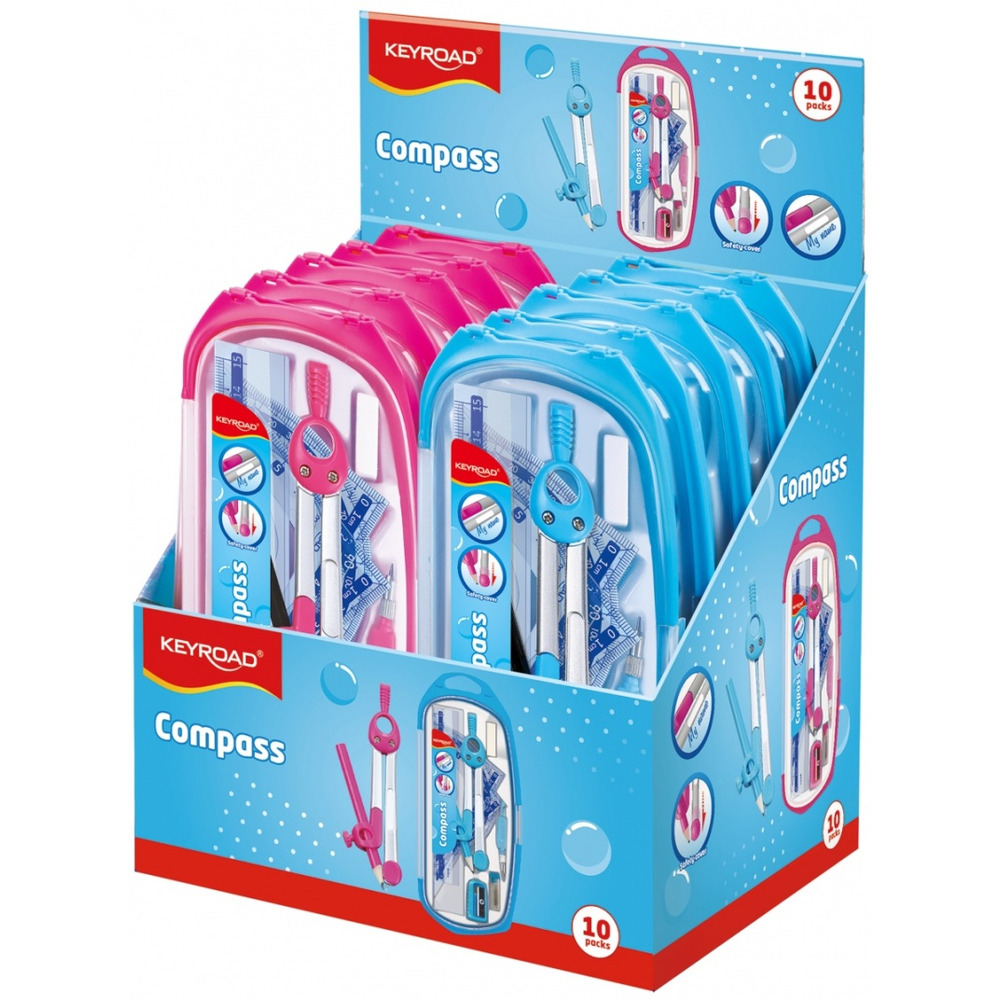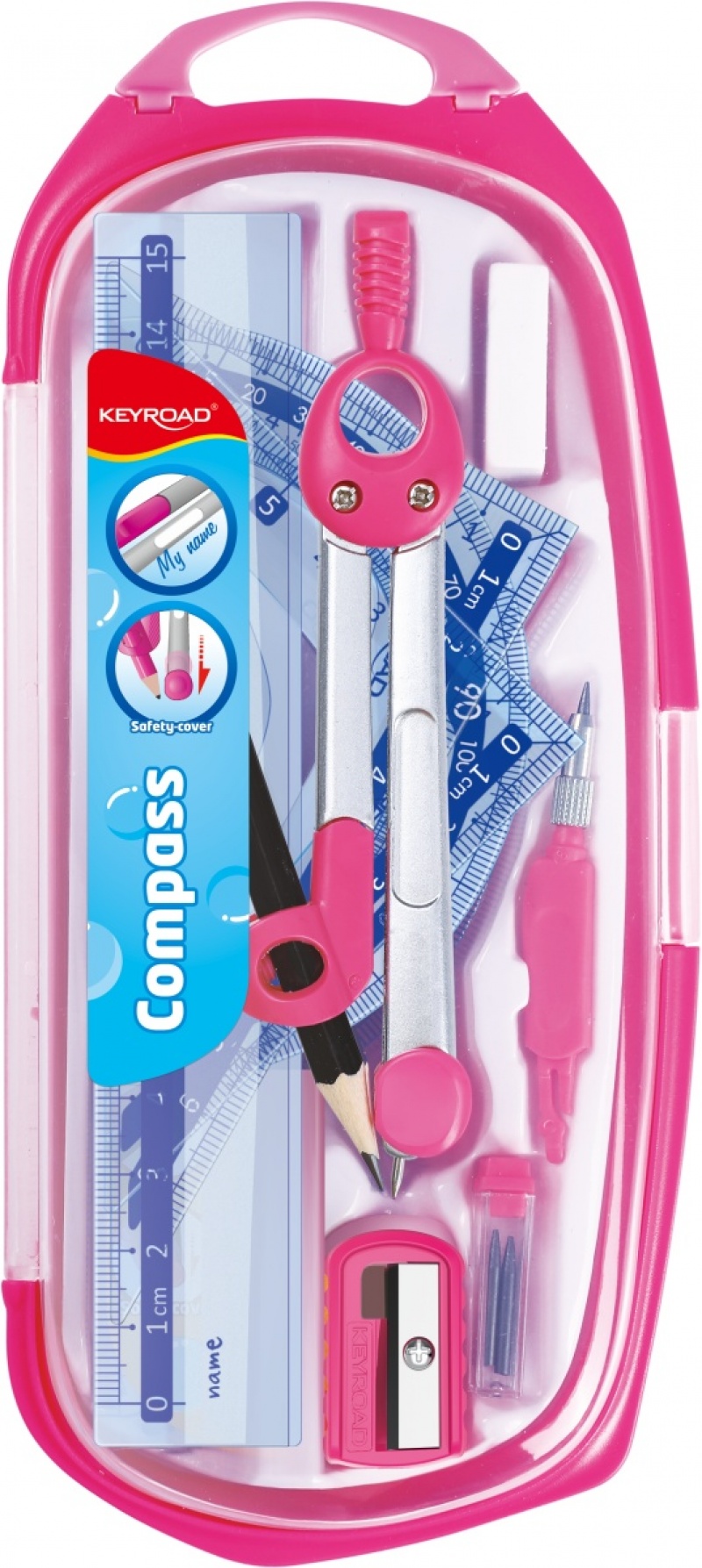 składa się z 9 elementów: cyrkla, gumki do ścierania, temperówki, kątomierza, linijki 15cm, wymiennej końcówki do cyrkla, ekierek 45° i 60° oraz czarnego ołówka