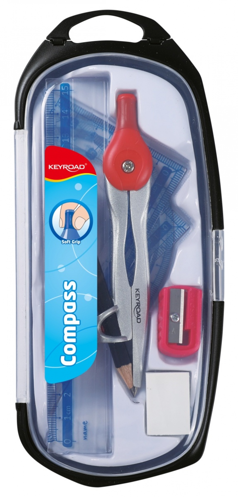 składa się z 8 elementów: cyrkla, gumki do ścierania, temperówki, kątomierza, linijki 15cm, ekierek 45° i 60° oraz czarnego ołówka