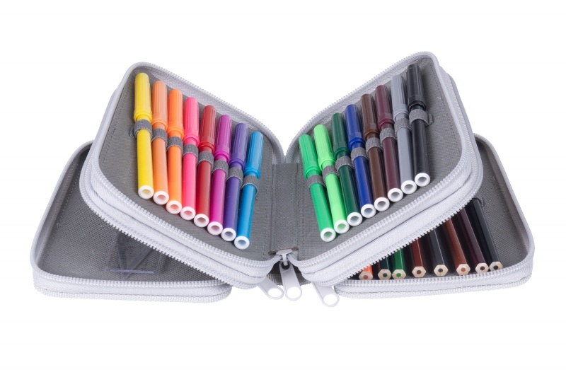 zestaw zawiera wyposażenie (linijkę, ekierkę, 3 szt. długopisów, ołówek, gumkę, temperówkę, 16 szt. flamastrów, 16 szt. kredek)