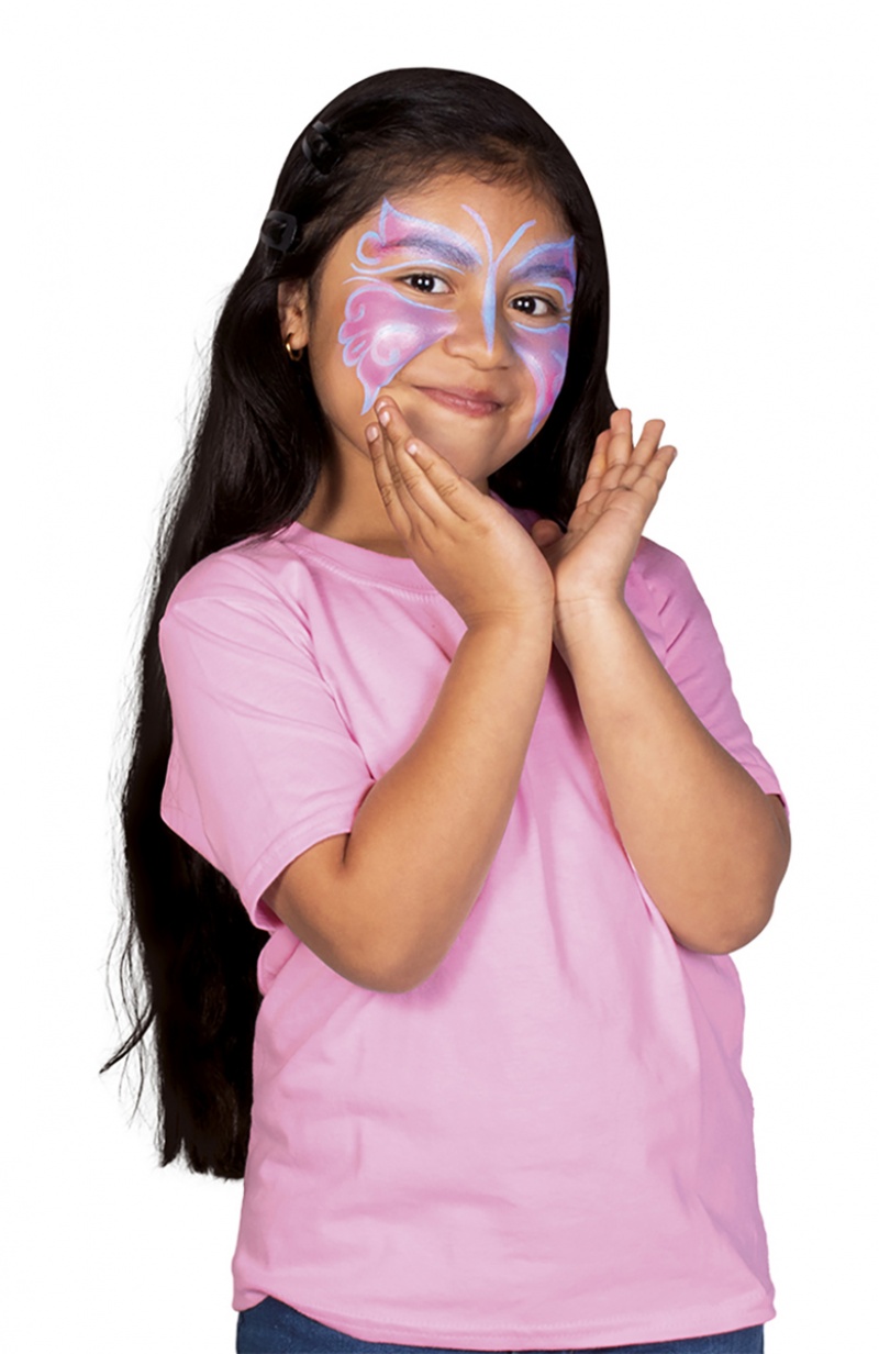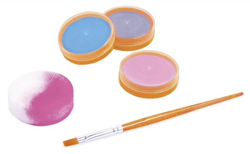 w komplecie znajdziesz trzy kremowe farby do twarzy po 8ml w kolorach różowym, jasnoniebieskim i srebrnym, a także gąbkę do aplikacji oraz płaski pędzel