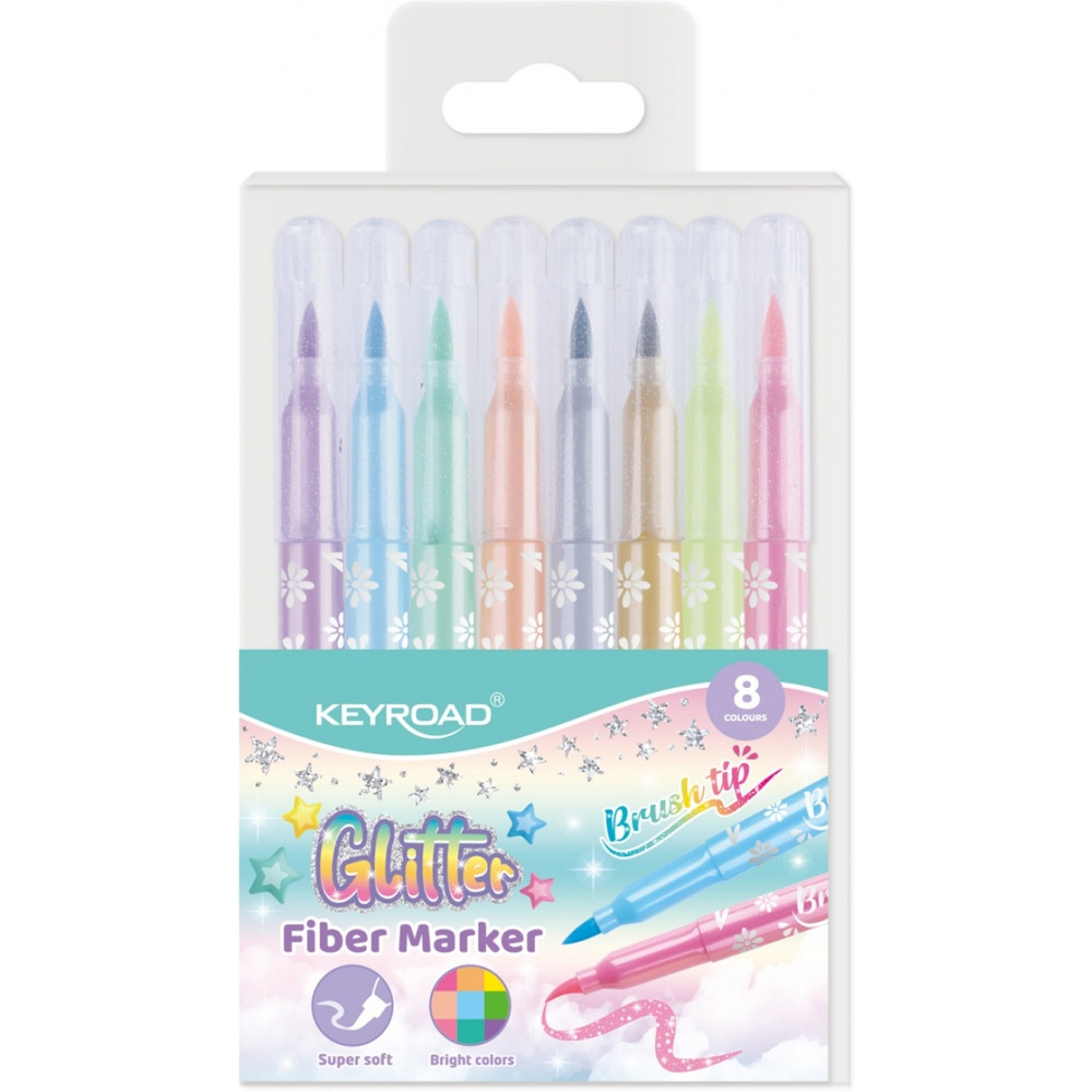 Flamastry KEYROAD Fiber Marker Glitter, zakończone pędzelkiem, brokatowe, 8 szt., mix kolorów pastelowych