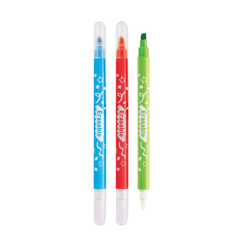 każdy flamaster został wyposażony w dwie precyzyjne końcówki: nasyconą kolorystycznie do wyrazistego malowania oraz wymazywalną do błyskawicznej korekty
