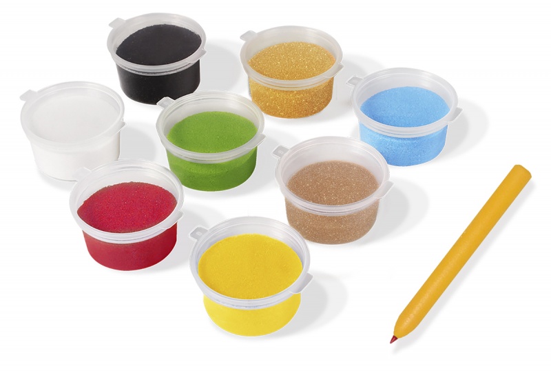 kolorowy zestaw do malowania piaskiem w poręcznej walizce zawierający 8 słoiczków z piaskiem...